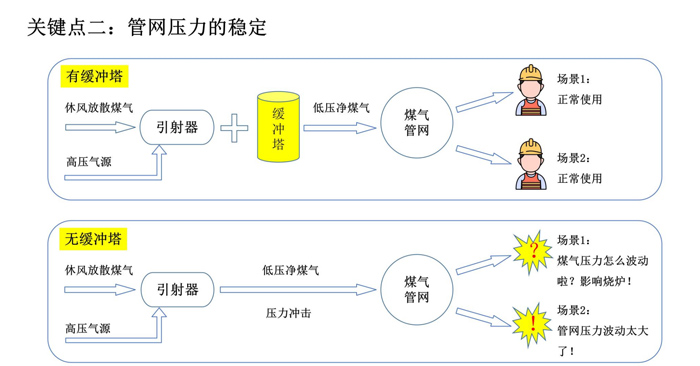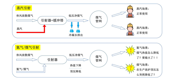 优选蒸汽作为高压引射气源,不影响管网煤气热值。引射系统后设置缓冲塔,有效减少回收过程对管网的压力冲击。模拟休风放散场景,回收过程与以往休风放散时长相近。