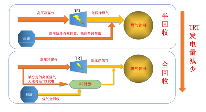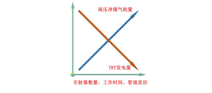 采用引射方法回收均压煤气,是利用高压净煤气引射低压煤气。高压净煤气是用于TRT压差发电的,因此引射消耗的高压净煤气越多,TRT发电量就会减少。